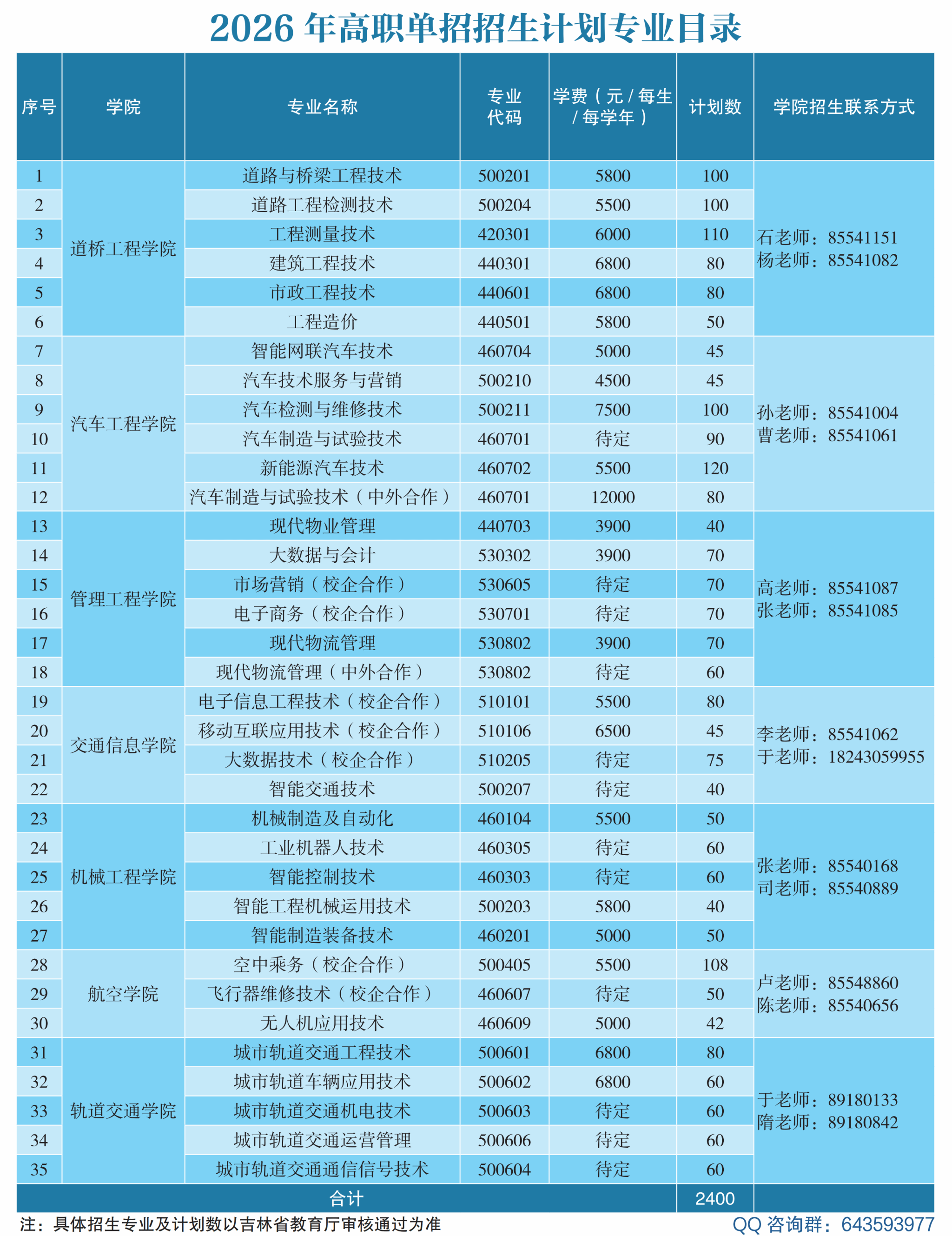 吉林交通职业技术学院2026年高职单招招生计划